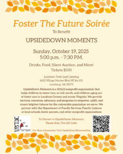Join us at the Foster the Future Soiree to benefit UpsideDown Moments on Sunday, October 19 from 5:00 – 7:30 P.M. at Twin Leaf Catering in Leesburg, VA.