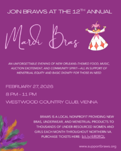 It’s a powerful opportunity for businesses to connect with the community while supporting a mission that truly matters. The proceeds from Mardi Bras help ensure that low-income women in Loudoun and across the DC metro area have access to period products, underwear, and bras – essentials that are often overlooked, but necessary for women to show up to school, work, and life with dignity. We hope to celebrate—and make a difference—with you at Mardi Bras 2026!
